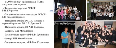 Ulyana Chebotar – lecturer at the Musical Theatre Department of the Moscow Institute of Culture, musical theatre and dubbing actress (vocals)